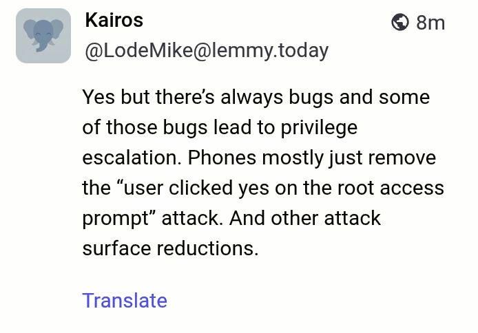 Your original post was in c/linuxmemes , found here. Your follow-up question about phone security was a comment under that post. Although someone passing by might happen to be a senior pentester with a major mobile OS vendor, that is a community for posting funny memes.