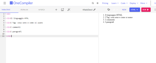 n quest’articolo vediamo come creare l’indice di una guida, supponiamo, sul linguaggio HTML. Apriamo OneCompiler e creiamo il seguente indice: