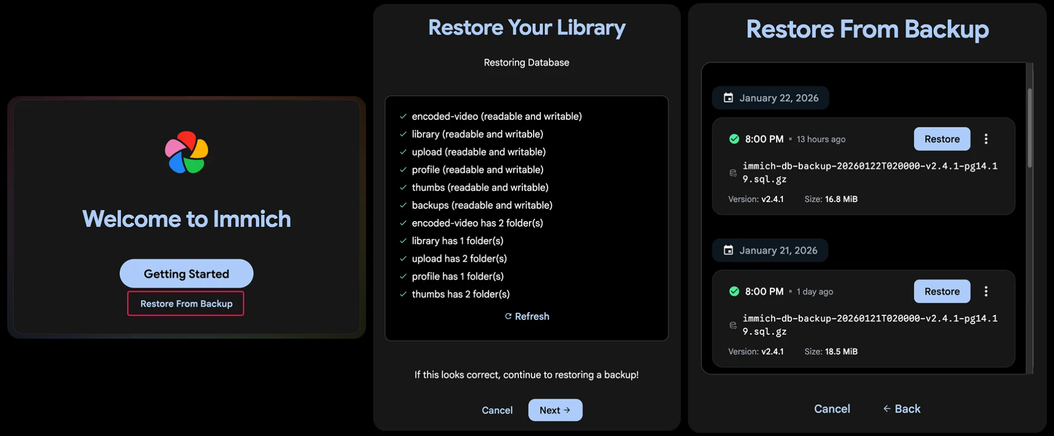 Now, we have the entire backup and restore pipeline built into Immich, which allows you to quickly restore a database backup directly from the web UI. You can perform the steps either from the Administration > Maintenance page, or from a brand new instance on the welcome page.