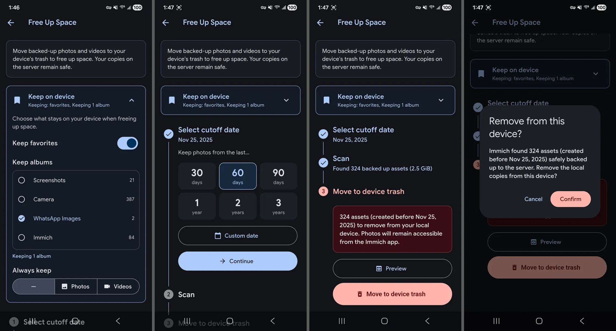 **Keep albums**. By default, favorited assets are preserved on your device. - Keep on device: You can choose to restrict removal to