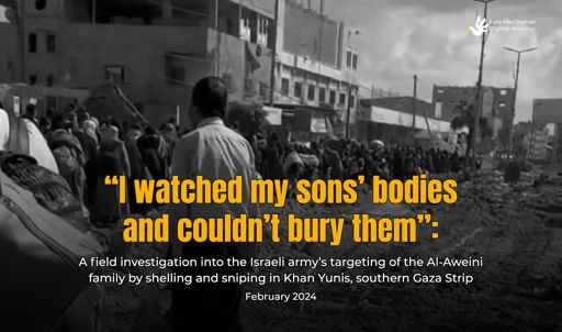 The report is based on an extensive field investigation into an Israeli aerial attack on the Al-Aweini family home, carried out by drones at least three times without prior warning. It also documents Israeli soldiers sniping family members near the Nasser Medical Complex, leaving them to bleed to death while preventing their rescue. Israeli forces further obstructed all attempts to recover and bury their bodies.